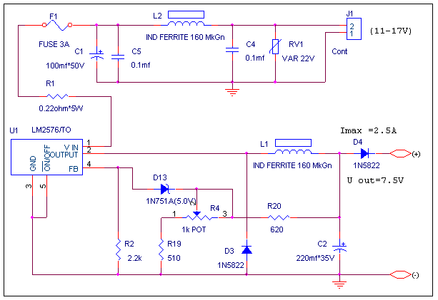 Схема представленная на рисунке представляет собой простой импульсный преобразователь напряжения от борт сети автомобиля. Основное назначение - питание различных мобильных средств связи или различных зарядных устройств. Переменным сопротивлением устанавливается уровень выходного напряжения. Величина максимального тока ограничивается сопротивлением R1.