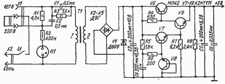 Особенность этого блока питания состоит в том, что сетевой трансформатор вместе с балластными цепями R3C1 и R1C2 работает в режиме генератора тока, т. е. обладает большим внутренним сопротивлением. Это позволило непосредственно после выпрямителя (V2-V5) включить стабилитрон V1 и таким образом осуществить первую ступень стабилизации напряжения. Дальнейшая стабилизация происходит в электронном стабилизаторе на транзисторах V6-V9. В качестве опорного источника использован эмиттерный переход транзистора V8. Регулирующий каскад собран на транзисторах V6, V7, V9, включенных по схеме составного эмиттерного повторителя. Керамический конденсатор С6 предназначен для снижения выходного сопротивления стабилизатора на высоких частотах.