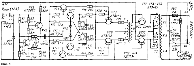Это устройство незаменимо в тех ситуациях, когда необходимо питать какие-либо механизмы или приборы, рассчитанные на напряжение переменного тока 36, 127, 220 В частотой 50 Гц, например, электронасос “Крот”, электробритву “Микма”, электропаяльник, а единственным источником электроэнергии оказывается аккумуляторная батарея автомобиля.