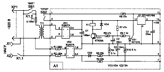 Рис. 1.37 При использовании второго варианта схемы упрощается и блок А1. В этом случае стабилизатор D1 не нужен, а если у трансформатора Т1 имеется свободная обмотка на напряжение 6...12 В, то она может быть подключена к цепям 5 и 6 (вместо резисторов R1...R3 установить перемычки, R4 и R10 исключить из схемы).