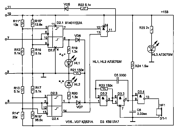 Электрическая схема устройства состоит из четырехуровневого компаратора на элементах микросхемы D2, звукового генератора на элементах D3.1...D3.3, узла коммутации на транзисторе и реле К1, а также блока питания со стабилизатором напряжения на микросхеме D1.