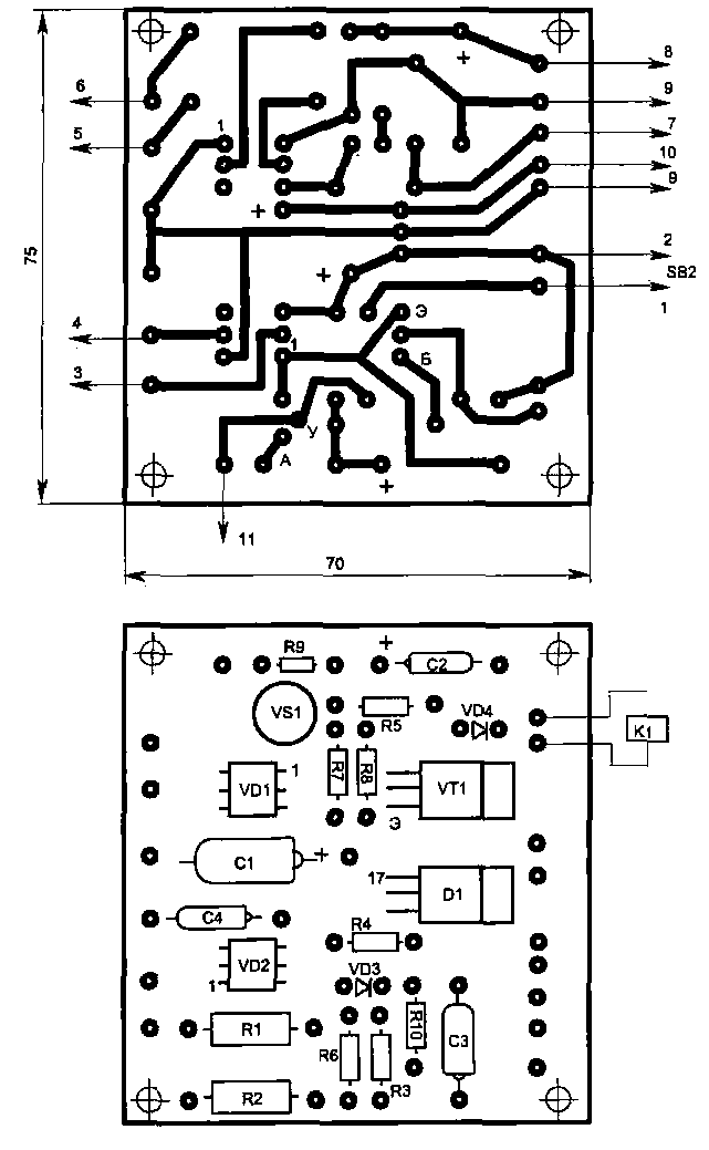 Топология печатной платы для узла А1 В процессе работы защитного устройства схема производит непрерывный контроль за состоянием сети, и при выходе напряжения за допуск 190...245 В начинает работать звуковая сигнализация, предупреждая, что лучше выключить радиоаппаратуру. При этом по свечению светодиодного индикатора можно определить вид отклонения напряжения в "+" (увеличение) или "—" (снижение). В случае опасного несоответствия сетевого напряжения (при выходе за допуск 170...260 В) радиоаппаратура, подключенная к гнездам Х1, Х2, отключится автоматически.
