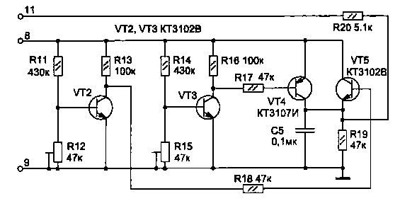 Устройство автоматической защиты можно упростить, если отказаться от звуковой и световой сигнализации отклонения напряжения. В этом случае схему контроля уровня напряжения на рис. 1.35 заменяем приведенной на рис. 1.37 . Она состоит из транзисторов, работающих в режиме микротоков. В нормальном состоянии подстроечными резисторами R12 и R15 устанавливаем на коллекторах VT2 и VT3 лог. "О" и лог. "1" соответственно. В этом случае транзисторы VT4 и VT5 заперты и на резисторе R19 нет напряжения (при его появлении сработает VS1).