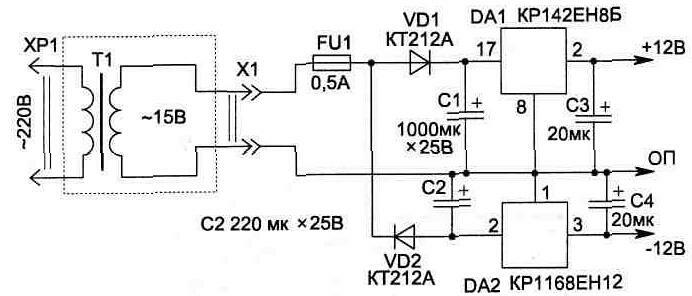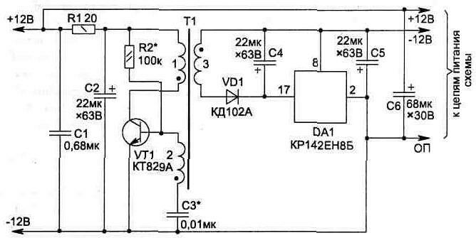 Иногда для питания различных радиотехнических устройств требуется иметь два двухполярных напряжения +12 и -12 В (или +9 и -9 В) от одного источника - аккумулятора или сетевого трансформатора с одной обмоткой. Такие напряжения необходимы для работы операционных усилителей и некоторых других схем. При этом основное потребление тока схемой осуществляется, как правило, по цепи с положительным напряжением, а цепь "-" является вспомогательной.