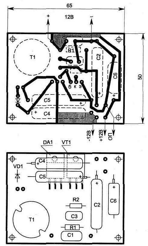 Все элементы схемы размещены на печатной плате с размерами 65х50 мм (рис. 5.7). Для уменьшения высоты платы монтаж выполнен в двух уровнях - конденсаторы С4 и С5 расположены над элементами VT1 и DA1. Схема позволяет получать и более высокое выходное напряжение, чем на входе, если использовать отрицательный выброс напряжения (рис. 5.5).