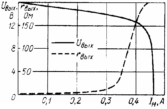 Экспериментально снятая нагрузочная характеристика зарядного устройства изображена на рис.2. При увеличении тока нагрузки до 0,35...0,4 А выходное напряжение изменяется незначительно, а при дальнейшем увеличении тока резко уменьшается. Если к выходу устройства подключить недозаряженную батарею аккумуляторов, напряжение на выходе моста VD1 уменьшается, стабилитрон VD2 выходит из режима стабилизации и, поскольку во входной цепи включен конденсатор С1 с большим реактивным сопротивлением, устройство работает в режиме источника тока.
