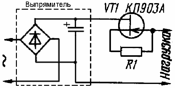 Схема подключения транзистора к блоку питания приведена на рис.1, а вольт-амперные характеристики транзистора для различных сопротивлений резистора R1 - на рис.2. Работает защита так. Если сопротивление резистора равно нулю (т. е. исток соединен с затвором), а нагрузка потребляет ток около 0,25 А, то падение напряжения на полевом транзисторе не превышает 1,5 В, и практически на нагрузке будет все выпрямленное напряжение. При появлении же в цепи нагрузки КЗ ток через выпрямитель резко возрастает и при отсутствии транзистора может достичь нескольких ампер. Транзистор ограничивает ток короткого замыкания на уровне 0,45...0,5 А независимо от падения напряжения на нем. В этом случае выходное напряжение станет равным нулю, а все напряжение упадет на полевом транзисторе. Таким образом, в случае КЗ мощность, потребляемая от источника питания, увеличится в данном примере не более чем вдвое, что в большинстве случаев вполне допустимо и не отразится на "здоровье" деталей блока питания.