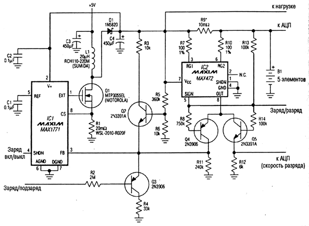 Транзистор Q3 выключается, вызывая увеличение напряжения на выводе обратной связи (FB), что приводит к уменьшению тока заряда до уровня тока компенсационного заряда (примерно 60 мА). Если микросхема IC1 выключается или суммарный ток нагрузки и заряда превышает допустимый для IC1 уровень, направление тока резистора R9 изменяется на противоположное, поскольку ток начинает течь от батареи. Микросхема IC2 отрабатывает изменение направления тока изменением состояния на выходе с открытым коллектором SIGN, на котором за счет резистора R13 появляется напряжение высокого уровня, выключая транзистор Q4 и включая транзистор Q5. В таком случае ток через резистор R12 создает напряжение, пропорциональное току разряда батареи (ток 5 А через R9 вызывает появление на резисторе R12 напряжения равного 3 В). Интегрируя это напряжение по времени (измеряя его через фиксированные промежутки и умножая на длительность интервала), аналого-цифровой процессор отслеживает энергию, потребленную от батареи. По полученным данным и по замерам напряжения на батарее процессор может затем вновь включить режим быстрого заряда установкой низкого уровня на линии БЫСТРЫЙ/КОМПЕНСАЦИОННЫЙ ЗАРЯД вплоть до того момента, когда батарея полностью выработает свой ресурс.