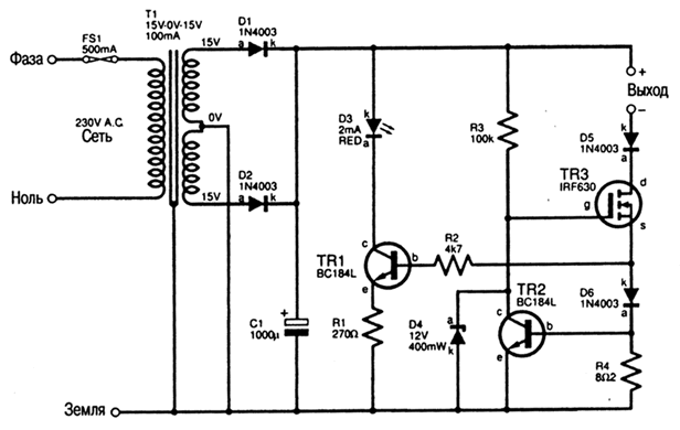 Мощный МОП транзистор TR3 включен в активном режиме, так как через резистор R3 на его затвор подано положительное напряжение смещения. Ток, текущий через нагрузку, вызывает появление напряжения на токозадающем резисторе R4. Когда оно достигает 0,5 В, транзистор TR2 начинает открываться, уменьшая напряжение на затворе (g) транзистора TR3. В установившемся режиме ток нагрузки будет такой величины, при которой напряжение на резисторе R4 равно 0,5 В. Стабилитрон D4 защищает цепь затвора МОП транзистора TR3 от появления на ней полного напряжения питания (это происходит, если схема включается без нагрузки, то есть в тех случаях, когда аккумулятор отключен). Диод D6 компенсирует падение на эмиттерном переходе транзистора TR1, так что напряжение на резисторе R4 повторяется на резисторе R1, определяющем ток светодиода D3.