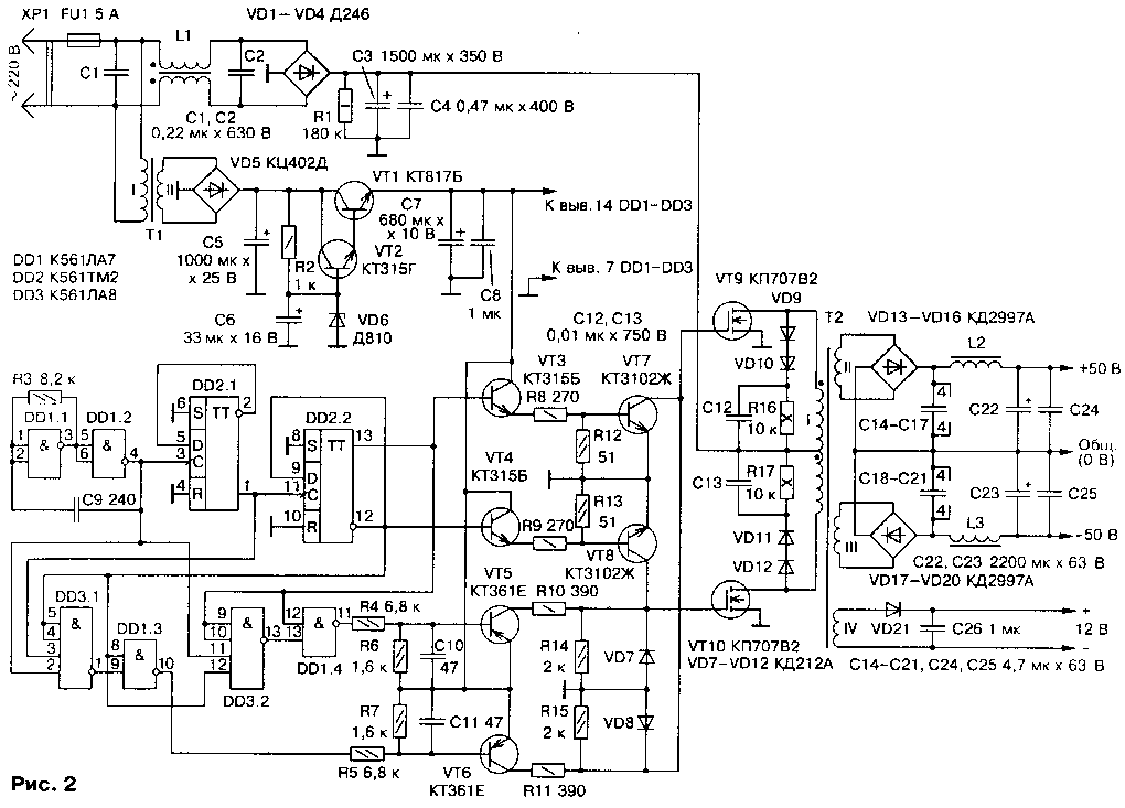 Выпрямленное напряжение обмотки IV трансформатора Т2 используют для питания вентиляторов (см. далее).