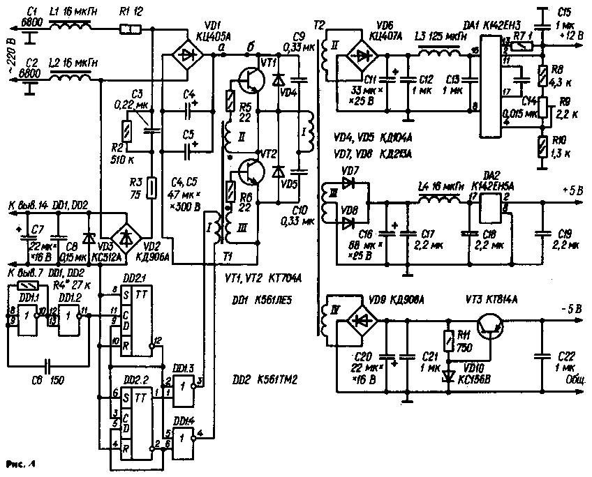 По структуре предлагаемое вниманию читателей устройство не ново: выпрямитель напряжения сети - конденсаторный фильтр - так называемый полумостовой преобразователь постоянного напряжения в переменное (с понижающим трансформатором) - выпрямители - фильтры - стабилизаторы. Однако в отличие от многих подобных источников питания такой структуры, описанных в литературе, в этом применено внешнее возбуждение преобразователя. Это позволило оптимально сформировать базовый ток ключевых транзисторов и тем самым полностью исключить сквозной ток через них и в результате - снизить потери в транзисторах и выпрямительных диодах и уменьшить излучаемые преобразователем помехи. Применение внешнего возбуждения также существенно упрощает налаживание этой части устройства и поиск дефектов. Принципиальная схема блока питания изображена на рис. 1, а диаграммы сигналов в его характерных точках - на рис. 2. Первичная (I) обмотка основного трансформатора Т2 преобразователя включена в диагональ моста, образованного транзисторами VT1, VT2 и конденсаторами С9, С10. Базовые цепи этих транзисторов питаются от обмоток II и III трансформа тора Т1, на первичную обмотку которого поступает ступенчатое напряжение с формирователя, собранного на микросхемах DD1, DD2.