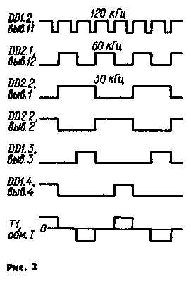 Задающий генератор формирователя собран на инверторах DD1.1, DD1.2 и вырабатывает колебания частотой около 120 Гц. Импульсы с выходов триггеров DD2.1 (частота следования 60 кГц) и DD2.2 (30 кГц) поступают на входы элементов DD1.3 я DD1.4, в результате чего на их выхода формируются импульсные последовательности со скважностью 4. Их разность (рис. 2, диагр. "Т1, обм. I") имеет вид импульсов чередующейся полярности длительностью около 8 мкс с паузами такой же продолжительности между ними.