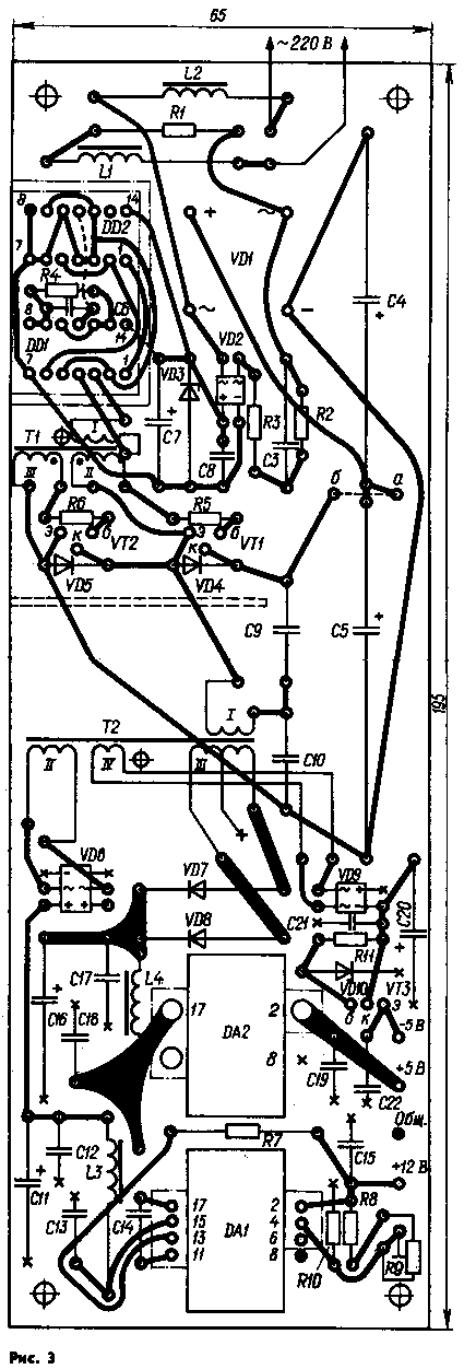 С кромок всех остальных отверстий фольга удалена путем зенковки сверлом примерно вдвое большего диаметра. Освобождены от фольги также участки около отверстий под выводы микросхем DA1, DA2.
