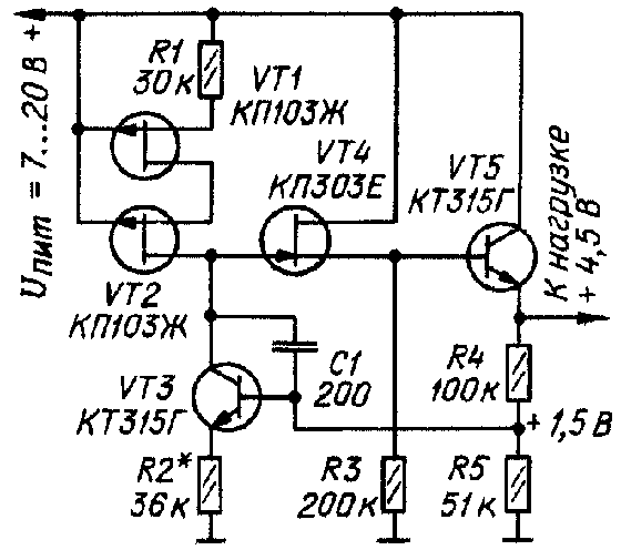 Идея температурной стабилизации выходного напряжения сводится к следующему. Напряжение Uбэ между базой и эмиттером биполярного транзистора при фиксированном токе коллектора имеет отрицательный температурный коэффициент -2 мВ/°С. В свою очередь, ток стока полевого транзистора в области микротока из-за температурного дрейфа напряжения отсечки. равного примерно +2 мВ/°С, зависит от температуры с коэффициентом около +10-3/°С. Этот ток, протекая через резистор R2 стабилизатора создает падение напряжения, которое при определенном значении сопротивления R2 будет иметь температурный коэффициент +2 мВ/°С. Таким образом, выходное напряжение, равное Uвых=(UБЭ3+UR2) (R4/R5+1), от температуры зависеть почти не будет (UБЭ3 - напряжение на эмиттерном переходе транзистора VT3). Наименьшего значения температурного коэффициента можно добиться, если тщательно подобрать резистор R2.