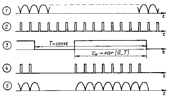 Принципиальная схема регулятора изображена на рис.1, а на рис.2 показаны временные диаграммы, иллюстрирующие принцип его работы (на диагр. 1-4 напряжения сняты относительно катода тринистора, а на диагр. 5 - между точками 1 и 5). Устройство состоит из мультивибратора с регулируемой скважностью импульсов (DD1.1, DD1.2), формирователя импульсов (DD1.4), узла совпадения (DD1.3). Мультивибратор формирует импульсы длительностью от 0 до Т при постоянном периоде следования Т (диагр. 3). В крайнем нижнем по схеме положении движка переменного резистора R1 на выходе элемента DD1.2 будет сигнал низкого уровня, что соответствует нулевой мощности в нагрузке, а в другом-сигнал 1, что соответствует 100 % мощности. В моменты, когда выпрямленное сетевое напряжение равно нулю (диагр. 1), формирователь вырабатывает короткие импульсы (диагр. 2). Узел совпадения пропускает на базу транзистора VT1 пачки импульсов (диагр. 4), которые управляют включением тринистора. Тринистор открывается и пропускает в нагрузку соответствующее число полупериодов выпрямленного напряжения (диагр. 5).
