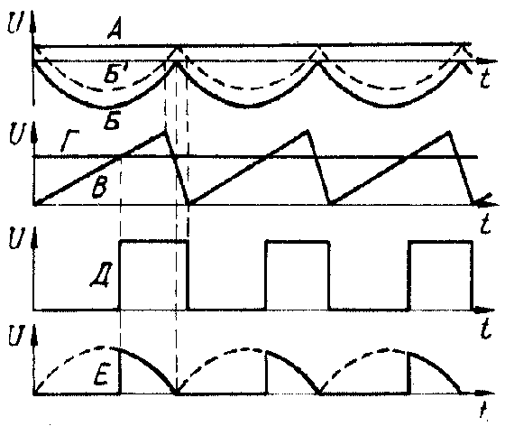 Как только значения напряжения на базе транзисторов VT4 и VT5 сравняются, транзистор VT4 откроется. Вслед за ним откроется транзистор VT3 и сформирует импульс тока (Д), открывающий тринистор VS1. С этого момента полупериода на нагрузку будет подано выпрямленное напряжение с обмотки III трансформатора Т1 (диаграмма Е). Чем больше напряжение на базе транзистора VT5, тем позже будут возникать импульсы, открывающие тринистор, и тем меньше будет средний ток через нагрузку.