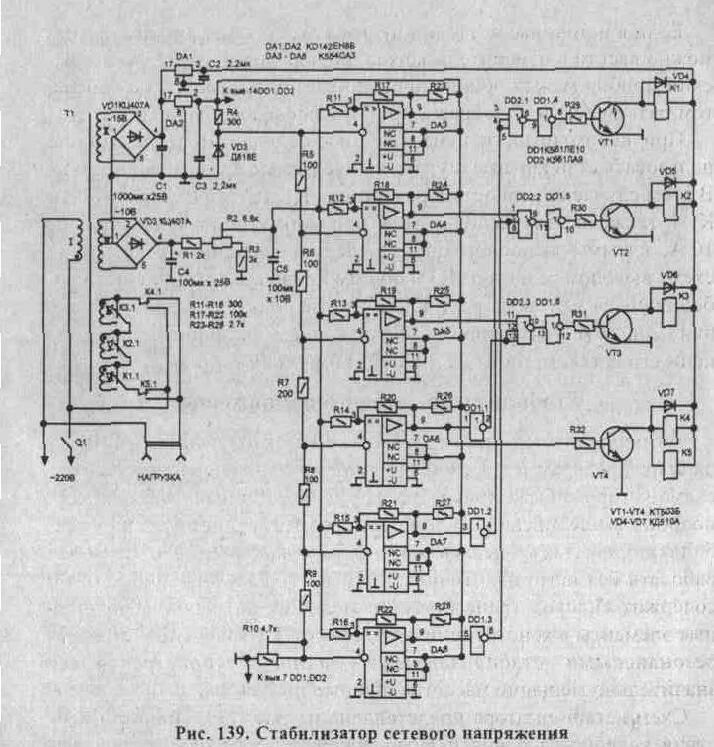 Схема стабилизатора представлена на рис. 139. Принцип действия устройства основан на включении последовательно с нагрузкой одной, двух или трех дополнительных обмоток трансформатора при отклонении сетевого напряжения от нормы. Если сетевое напряжение ниже необходимого, то дополнительные обмотки включаются синфазно с сетью, и напряжение на нагрузке становится больше сетевого; если же напряжение сети становится выше нормы, то обмотки включаются в противофазе с сетевым напряжением, приводя к уменьшению напряжения на нагрузке. Роль такого трансформатора выполняет Т1, а дополнительных обмоток - обмотки IV, V, VI.