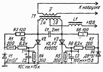 При подключении питания тринисторы V2, V3 попеременно открываются, создавая пульсирующий ток в первичной обмотке трансформатора Т1. На вторичной обмотке появляется напряжение, от которого питается нагрузка.