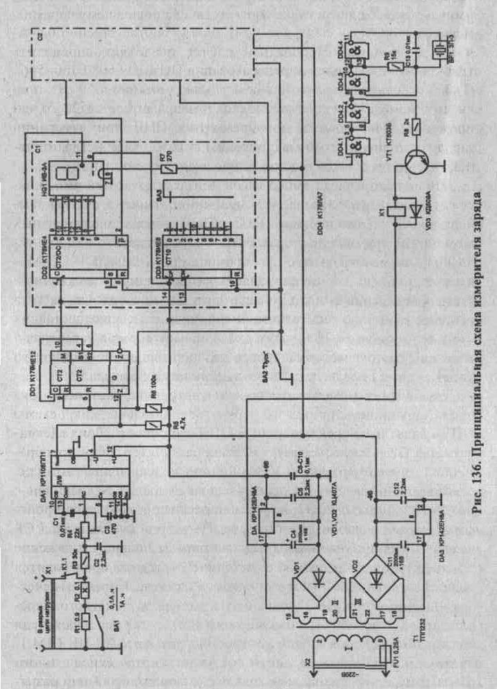 Принципиальная схема устройства приведена на рис. 136. Основой устройства является преобразователь напряжения в частоту (ПНЧ), выполненный на микросхеме DA1. Напряжение на вход ПНЧ поступает с токоизмерительных резисторов Rl, R2 (в зависимости от выбранного тумблером SA1 предела измерения), поэтому напряжение на входе ПНЧ пропорционально току зарядки. Поскольку функция преобразования ПНЧ линейная, частота на выходе ПНЧ прямо пропорциональна току зарядки.