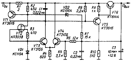 Такой стабилизатор обычно содержит источник образцового напряжения, дифференциальный усилитель, систему защиты и регулирующий элемент на составном транзисторе. В систему защиты входят устройство ограничения тока нагрузки и цепь со стабилитроном, включенным параллельно регулирующему элементу. Эта цепь формирует падающий участок нагрузочной характеристики. Ограничитель тока нагрузки построен на токоизмерительном резисторе, включенном между базой и эмиттером транзистора, шунтирующего эмиттериые переходы регулирующего элемента.