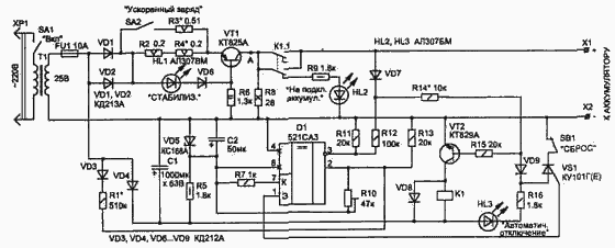 анное устройство имеет ряд дополнительных функций, способствующих удобству их использования. Так, при окончании заряда схема автоматически отключит аккумулятор от зарядного устройства. А при попытке подключить неисправный аккумулятор (с напряжением ниже 7 В) или же аккумулятор с неправильной полярностью схема не включится в режим заряда, что предохранит зарядное устройство и аккумулятор от повреждений. В случае короткого замыкания клемм Х1 (+) и Х2 (—) при работе устройства перегорит предохранитель FU1.