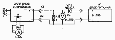 Для регулировки зарядного устройства потребуется источник постоянного напряжения с перестройкой от 3 до 15 В. Удобно воспользоваться схемой соединений, показанной на рис.2.