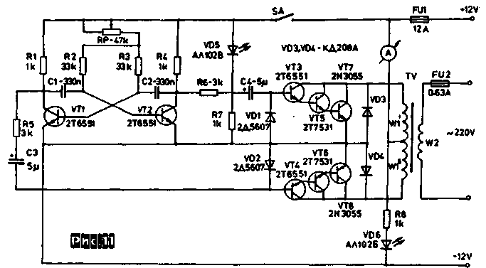 Предлагается схема преобразователя постоянного напряжения 12 В в переменное 220 В, который при подключении к автомобильному аккумулятору емкостью 44 А-ч может питать 100-ваттную нагрузку в течение 2-3 часов. Он состоит из задающего генератора на симметричном мультивибраторе VT1, VT2, нагруженного на мощные парафазные ключи VT3-VT8, коммутирующие ток в первичной обмотке повышающего трансформатора TV. VD3 и VD4 защищают мощные транзисторы VT7 и VT8 от перенапряжений при работе без нагрузки.