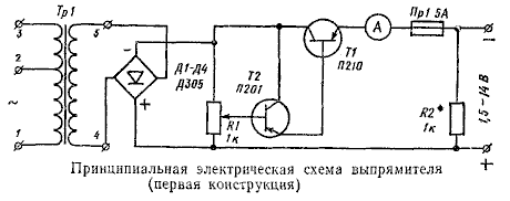 Первая конструкция. Выпрямитель (рис. 1) собран по мостовой схеме на четырех диодах Д1—Д4 типа Д305. Сила зарядного тока регулируется при помощи мощного транзистора Т1, включенного по схеме составного триода. При изменении смещения, снимаемого на базу триода с потенциометра R1, изменяется сопротивление цепи коллектор — эмиттер транзистора. Зарядный ток при этом можно изменять от 25 мА до 6 А при напряжении на выходе выпрямителя от 1,5 до 14 В.