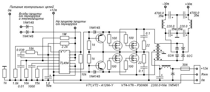 Схема, приведенная на рисунке - блок питания от автомобильного усилителя Jensen (4x40 Вт). Схема упрощена - не показаны каскады защиты от перегрузок усилителей по току и термозащиты. Группы электролитических конденсаторов показаны как один конденсатор суммарной емкости. Трансформатор преобразователя намотан на ферритовом кольце К42х28х10. Первичная обмотка намотана "косой" из восьми проводов диаметром 1,2 мм и содержит 6,5 витков; вторичная - "косой" из четырех проводов диаметром 1 мм. После намотки каждая коса разделена на две части и начало одной половины обмотки соединяется с концом другой. Дроссель намотан на ферритовом стержне диаметром ~16 мм. и содержит ~10 витков провода диаметром 2мм. Его данные не критичны.