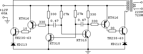 Этот преобразователь, как утверждает автор, работает на нагрузку мощностью до 700 Вт. Резисторы 15 и 30 Ом - проволочные, большой мощности. Трансформатор выбирается исходя из требуемой выходной мощности. Вторичная обмотка - на 24 В с отводом от середины. Источник: http://steve.sky.net.ua