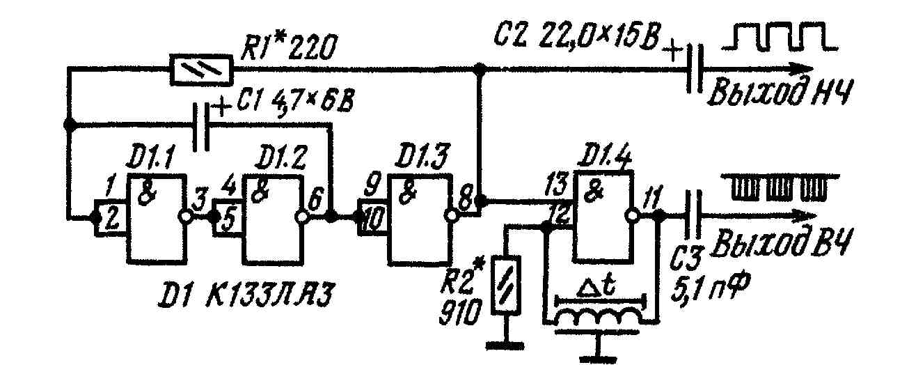Как известно, микросхемы серий К130, К133, К155 хорошо работают на частотам до 10...15 МГц, Однако, как показал эксперимент, они сохраняют работоспособность и на более высоких частотах - вплоть до 100 МГц, правда, при этом снижается выходное напряжение. На рисунке приведена схема генератора-пробника для телевизора. На элементах D1.1 — D1.3 собран генератор низкой частоты, а на элементе DI. 4 — генератор ВЧ, вырабатывающий синусоидальные колебания с частотой около 77 МГц. В качестве ,линии задержки, включенной в цепь обратной связи этого элемента, был использоваи отрезок провода МГТФ-0,07 длиной 22 см. Частоту генерации можно изменять, подбирая длину провода. Резистор R2 необходим для улучшения формы колебаний. При проверке телевизора высокочастотный выход пробника подключают к антенному гнезду, ПТК устанавливают