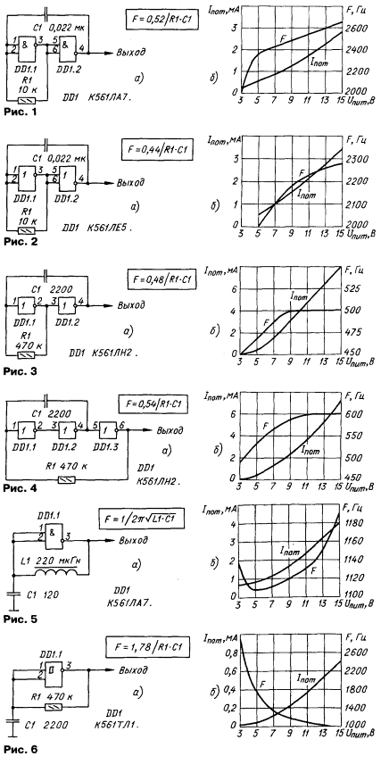 В предлагаемой статье кратко описаны несколько схемных решений генератора прямоугольных импульсов, по строенного на различных микросхемах серии К561. По своей структуре статья - сравнительно-справочная. К каждой схеме дан перечень параметров и особенностей (см. таблицу), а также графические зависимости потребляемого тока и генерируемой частоты от напряжения питания.