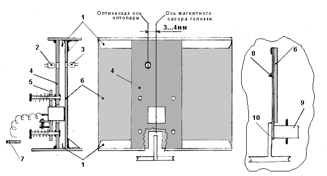 1- направляющие желобки из жести; 2- светодиод; 3- фотодиод; 4- неподвижная пластина узла головки; 5- подвижная пластина узла головки; 6- основание; 7- контактная плата; 8- магнитная карточка; 9- тонролик; 10- тонвал.