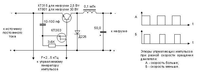 А что, если обойтись без повышенного напряжения для питания мотора, а просто выключать его на очень короткое время - скажем, на сотые доли секунды? Остановиться он не успеет - будет вращаться по инерции. Если обороты увеличились (при уменьшении нагрузки), то продолжительность паузы автоматически станет возрастать, и наоборот. Тогда потребление энергии резко сократится - она нигде не "гасится", нагрузка лишь на время отключается от источника питания. Однако сделать такой "выключатель" непросто. Тем более что в момент раскрутки двигателя ток его велик и напряжение источника питания может "подсаживаться".