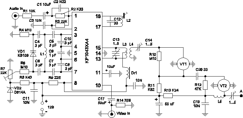 Передатчик работает в диапазоне ДМВ (UHF) и построен на одной микросхеме и двух СВЧ транзисторах. Он обеспечивает идеальное качество цветной картинки на расстоянии около 50 м. Максимальный радиус действия зависит от чувствительности телевизора, применяемых антенн, и для цветного изображения составляет 300 м, а черно белого - более 500. Принципиальная схема передатчика приведена на рисунке.