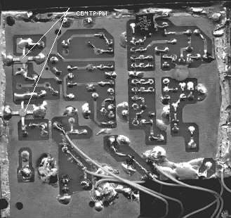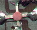 К сожалению, тип СВЧ транзисторов мне неизвестен, так как на них отсутсвует маркировка. Транзисторы имеют керамический корпус диаметром 2 мм и толщиной 1 мм, и показаны на фото (увеличено). Применимы любые СВЧ транзисторы с граничной частотой более 2 ГГц и мощностью не менее 50 мВт. Детали передатчика размещены на печатной плате из фольгированного с одной стороны стеклотекстолита. Принципиальная схема начерчена с таким расчетом, чтобы по ней можно было легко вычертить разводку печатной платы. При этом следует учитывать, что ширина проводников должна быть не менее 1 мм. Проводник "массы" выполняется сплошной заливкой свободного пространства платы, на расстоянии 1-2 мм от прочих проводников. Важно, чтобы выводы микросхемы 5 и 14 соединялись друг с другом под микросхемой и с массой кратчайшим путем. Следует стремиться к тому, чтобы и остальные проводники были минимальной длины. Обязательна пропайка обоих выводов эммитера СВЧ транзисторов.