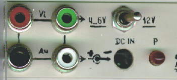 На передней панели размещены входные розетки (на фото на панели размещены по две спаренные розетки аудио и видео для обеспечения возможности включать передатчик шлейфом с другим оборудованием). Устанавливают также разьем питания и светодиод.