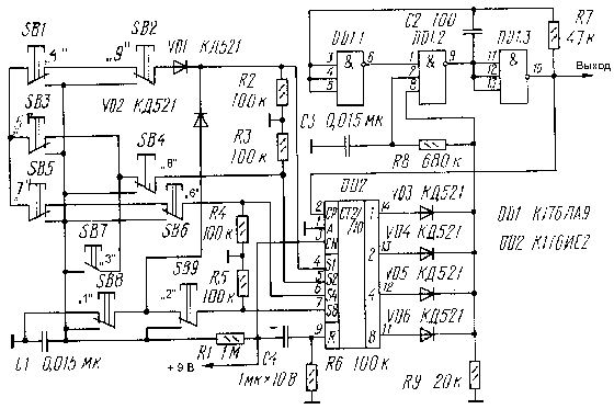 При включении питания счетчик DD2 устанавливается в нулевое состояние (0000), а конденсатор С1 начинает заряжаться через резистор R1. При кратковременном нажатии на одну из кнопок SB1-SB9 конденсатор С1 разряжается через один из резисторов R2-R5 (в зависимости от нажатой кнопки), а счетчик принимает одно из девяти состояний (десятое состояние - исходное, 0000). На выводе 8 микросхемы DD1 устанавливается уровень логической единицы и через резистор R8 заряжается конденсатор С3. Параметры цепи R8C3 выбраны так, что включение генератора задержано на время разряда конденсатора С1.