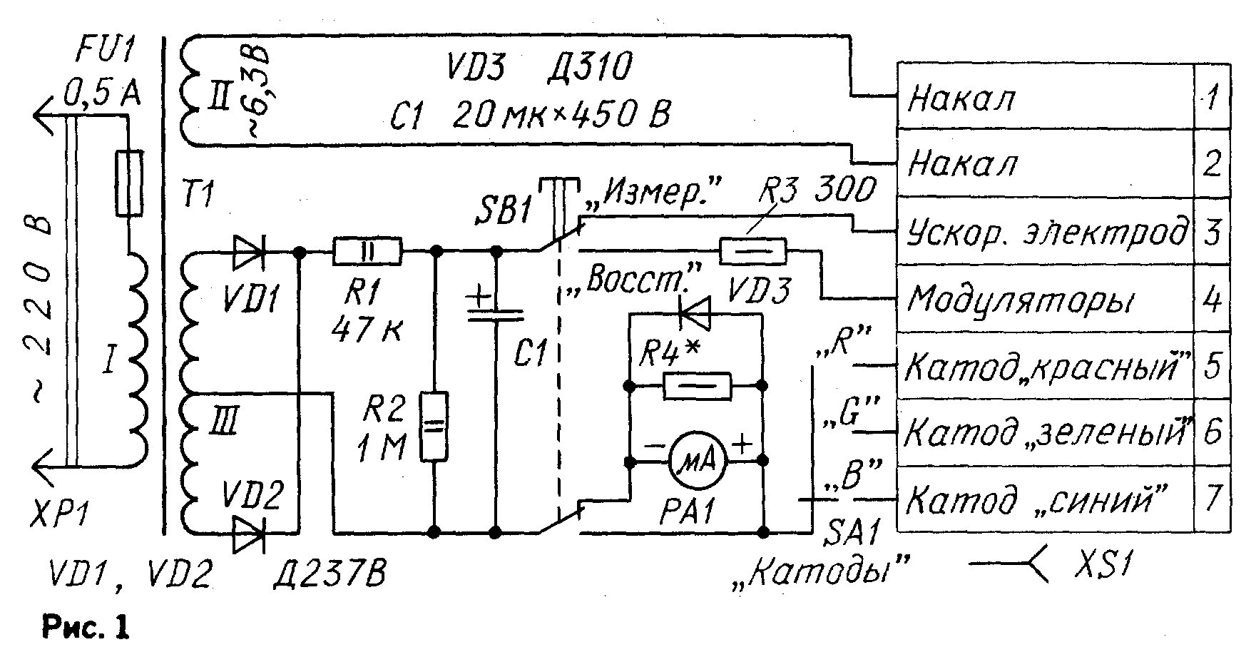 При включении прибора в сеть и подключенном кинескопе на его цепь накала с обмотки II трансформатора Т1 поступает переменное напряжение в пределах 6,3...7 В. Одновременно с двуполупериодного выпрямителя на диодах VD1, VD2 через ограничительный резистор R1 заряжается конденсатор С1 до напряжения 350...400 В. При ненажатой кнопке SB1 (режим «Измерение») через ее контакты, микроамперметр РА1, переключатель SA1 и соединительный кабель это напряжение приложено между ускоряющим электродом и одним из катодов кинескопа. Микроамперметр РА1 показываетток эмиссии катода, выбранного переключателем SA1.