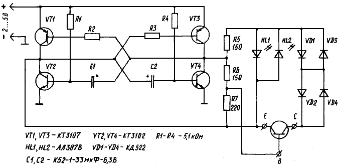 Как видно из схемы, вместо нагрузочных резисторов, в коллекторы транзисторов мультивибратора включены комплиментарные транзисторы.