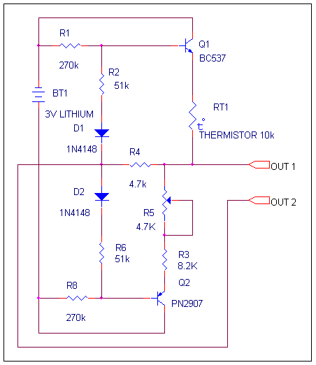 В основу построения схемы взят мостовой преобразователь. Изменение величины сопротивления термодатчика RТ1 приводит к разбалансу моста и появлению напряжения на контактах OUT1 и OUT2. Возможно к этим контактам подключение аналого цифрового преобразователя, далее преобразователя двоичного кода в 7-8 разрядный код и цифрового табло. Как более простое решение возможно подключение непосредственно на выход цифровой миливольтметр. Если изменить параметры моста, увеличив потребление тока возможно подключение аналогого прибора. Для применения в качестве исполнительного или регулируемого устройства датчик подключают на вход операционого усилителя.