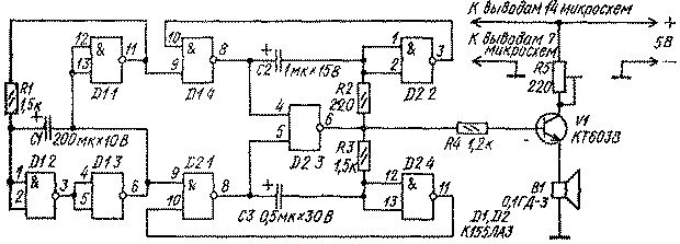 Импульсы переключающего генератора подаются на генераторы тона. Один из них выполнен на элементах D1.4, D2.2, D2 3, другой - на элементах D2.1, D2.4, D2.3. Частота первого генератора - 600 Гц (ее можно изменять подбором элементов С2, R2), частота второго - 1000 Гц (эту частоту можно изменять подбором элементов СЗ, R3). При работающем переключающем генераторе на выходе генераторов тона (вывод 6 элемента D2.3) будет периодически появляться то сигнал одного генератора, то сигнал другого. Затем эти сигналы поступают на усилитель мощности (транзистор V1) и преобразуются головкой В1 в звук. Резистор R4 необходим для ограничения тока базы транзистора. Подстроечным резистором R5 можно подобрать нужную громкость звучания.
