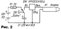 Включится генератор 34, и пьезоизлучатель BQ1 начнет издавать звуковой сигнал, свидетельствующий о попадании в цель. Затем устройство вернется в исходное состояние. Схема пистолета приведена на рис. 2. В его состав входит лазерная указка А1, интегральный стабилизатор напряжения DA1, накопительный конденсатор С1, кнопка-курок SB1 и батарея питания GB1. В исходном состоянии конденсатор С1 заряжен от батареи питания.