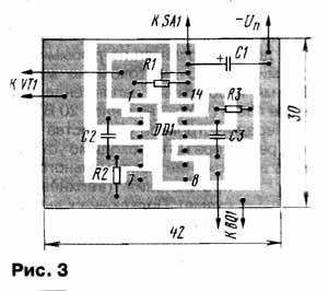 При нажатии на кнопку SB1 он подключится ко входу стабилизатора напряжения, в результате чего на лазерную указку поступит питающее напряжение 5 В. Она будет излучать свет в течение короткого отрезка времени (доли секунды), пока конденсатор не разрядится. Если свет попадет в мишень, прозвучит сигнал. После отпускания кнопки-курка конденсатор снова зарядится — пистолет готов к "выстрелу". Резистор R1 ограничивает зарядный ток конденсатора. Специального выключателя питания в пистолете нет, поскольку в режиме готовности ток от батареи практически не потребляется. Большинство деталей мишени размещают на печатной плате (рис. 3) из односторонне фольгиро-ванного стеклотекстолита.