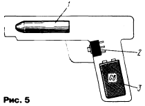 Вариант конструкции мишени, которую использовал автор, показан на рис. 4. Для защиты от внешней засветки фототранзистор 4 размещают в пластмассовом светонепроницаемом корпусе 1, в качестве которого применена баночка из-под фотопленки. Примерно посередине размещена перегородка 2 из матового органического стекла. Для повышения чувствительности можно установить светоотражающий конус 3 из ватмана. Корпус крепят к плате 5, на которой располагают и пьезоизлучатель 6. Конструкция пистолета показана на рис. 5. Для него понадобится корпус-"пустышка" подходящих размеров. Внутри него устанавливают лазерную указку 1 таким образом, чтобы она "стреляла" в полном соответствии с прицелом пистолета. Указку предварительно плотно обматывают изолентой, чтобы кнопка включения была нажата. В корпусе устанавливают также кнопку 2 и батарею питания 3. Монтаж ведут навесным методом.