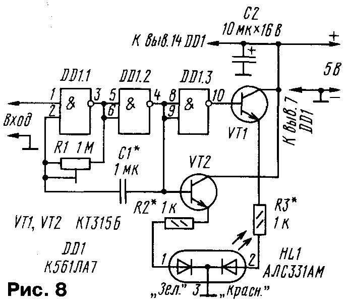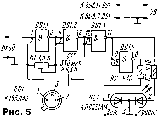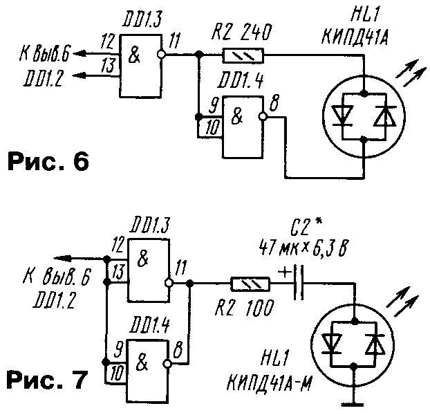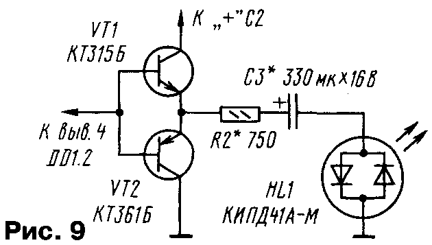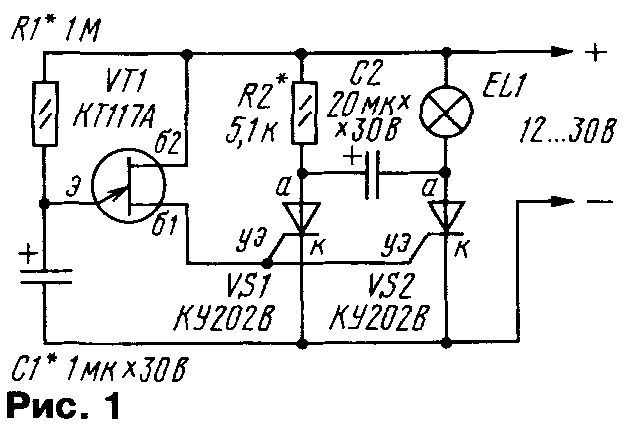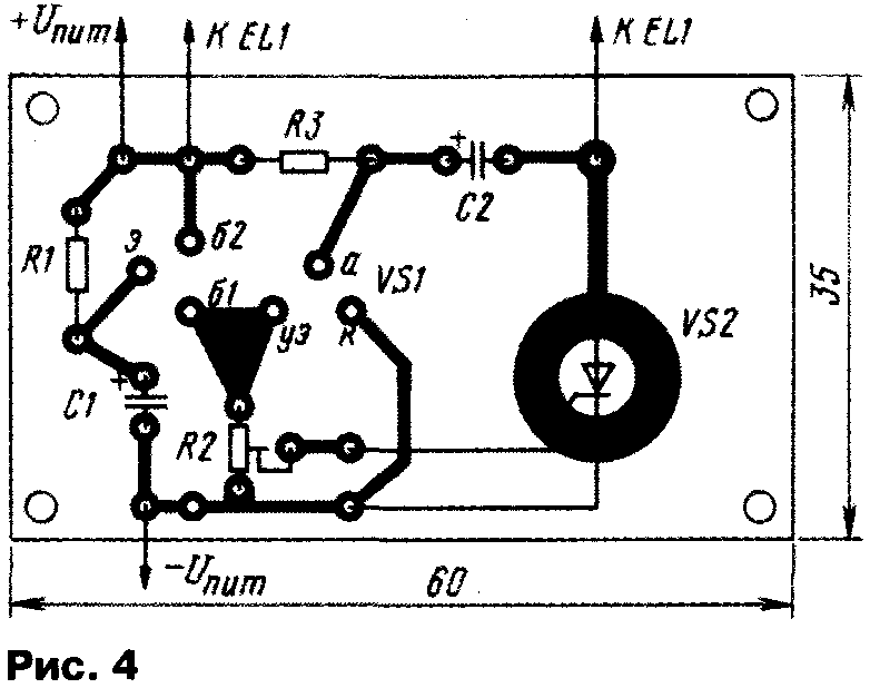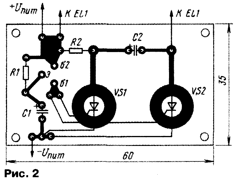У начинающих радиолюбителей весьма популярны разнообразные "мигалки" — генераторы световых импульсов. Их можно устанавливать на детские игрушки, использовать в аттракционах, размещать на видном месте в салоне автомобиля для имитации действия сторожевого устройства. С некоторыми вариантами таких устройств знакомит предлагаемая подборка. ...С ТРИНИСТОРАМИ Сравнительно простые "мигалки" получаются при использовании тринисторов. Правда, особенность работы большинства тринисторов заключается в том, что они открываются при подаче на управляющий электрод определенного напряжения (тока), а для их закрывания необходимо уменьшить анодный ток до значения ниже тока удержания. Если питать тринистор от источника переменного или пульсирующего напряжения, он будет автоматически закрываться при прохождении тока через ноль. При питании же от источника постоянного напряжения тринистор просто так закрываться не станет, придется использовать специальные технические решения. Схема одного из вариантов "мигалки" на тринисторах приведена на рис. 1. Устройство содержит генератор коротких импульсов на однопереходном транзисторе VT1 и два каскада на тринисторах. В анодную цепь одного из тринисторов (VS2) включена лампа накаливания EL1. Работает устройство так. В начальный момент после подачи питания оба тринистора закрыты и лампа не горит. Генератор вырабатывает короткие мощные импульсы с интервалом, определяемым параметрами цепочки R1C1. Первый же импульс поступит на управляющие электроды тринисторов, и они откроются. Лампа зажжется. За счет тока, протекающего через лампу, тринистор VS2 останется открытым, а вот VS1 закроется, так как его анодный ток, определяемый резистором R2, слишком мал. Конденсатор С2 начнет заряжаться через этот резистор и к моменту появления второго импульса генератора окажется заряженным. Этот импульс приведет к открыванию тринистора VS1, и левый по схеме вывод конденсатора С2 будет кратковременно подключен к катоду тринистора VS2. Но даже такого подключения достаточно, чтобы тринистор закрылся и лампа погасла. Таким образом, оба тринистора окажутся закрытыми, конденсатор С2 разрядится. Следующий импульс генератора приведет к открыванию тринисторов, описанный процесс повторится. Лампа вспыхивает с частотой, вдвое меньшей частоты генератора. Для указанных на схеме элементов можно использовать лампу накаливания (либо несколько ламп, включенных последовательно или параллельно) с током до 0,5 А. Если использовать все возможности указанных тринисторов, допустимо применить лампу, потребляющую ток до 5 А. В этом случае для надежного закрывания тринистора VS2 емкость конденсатора С2 надо увеличить до 330...470 мкф. Соответственно придется увеличить емкость конденсатора С1, чтобы в периоды между импульсами генератора конденсатор С2 успевал зарядиться. Тринистор VS2 следует разместить на небольшом радиаторе. Детали "мигалки" монтируют на печатной плате (рис. 2) из одностороннего фольгированного гетинакса или стеклотекстолита. Оксидный конденсатор С2 — обязательно алюминиевый, серий К50-6, К50-16,К50-35. Если ток лампы не превышает 0,5 А, один из тринисторов можно заменить на маломощный, например, КУ101А (рис. 3). Поскольку напряжения на управляющих электродах тринисторов, при которых они открываются, различны, в устройство введен подстроечный р