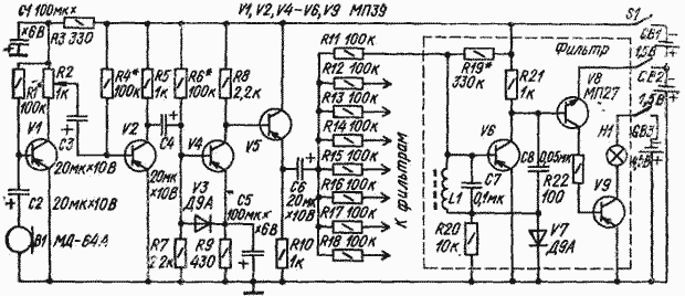 Каждый фильтр состоит из резонансного контура (катушка индуктивности L1 и конденсатор С7), усилителя НЧ (транзистор V6), детектора (диод V7) и трехкаскадного усилителя постоянного тока (транзисторы V6, V8, V9), нагруженного на индикаторную лампочку Н1.