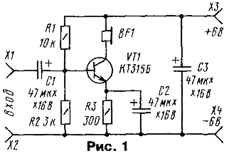 Усиливаемый сигнал поступает на входные гнезда Х1, Х2, а напряжение питания (как и во всех остальных конструкциях этого автора, оно составляет 6 В - четыре гальванических элемента напряжением по 1,5 В, соединенных последовательно) подается на гнезда Х3, Х4. Делитель R1 R2 задает напряжение смещения на базе транзистора, а резистор R3 обеспечивает обратную связь по току, что способствует температурной стабилизации работы усилителя.