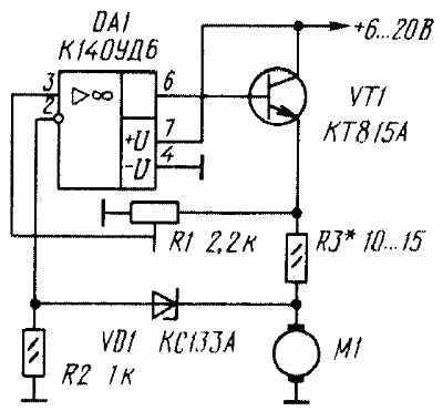 В предлагаемом варианте стабилизатора использовано всего шесть радиоэлементов (не считая электродвигателя), но удалось добиться более высокой стабильности работы при изменении температуры окружающей среды и напряжения источника питания. Диапазон питающих напряжений для данной схемы составляет 6...20 В.