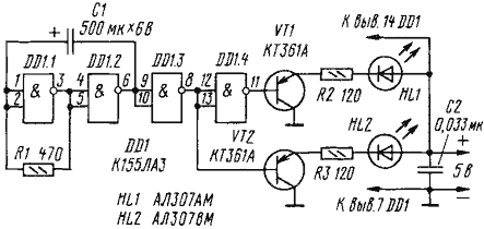 Основа устройства - генератор импульсов, выполненный на элементах DD1.1 и DD1.2. Частота импульсов зависит от емкости конденсатора С1 и сопротивления резистора R1. С генератора импульсы поступают на первый инвертор, собранный на элементе DD1.3, а с его выхода - на второй инвертор (элемент DD1.4). Инверторы управляют каждый "своим" транзистором, поочередно открывая их. В эмиттерные цепи транзисторов включены светодиоды последовательно с ограничивающими ток резисторами (R2 и R3).